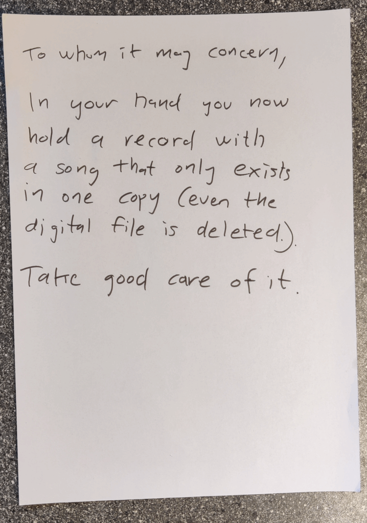 The idea is that these records can be listened to even after the end of the world. If a future generation finds a vinyl record they will be able to construct a machine, without prior knowledge, to listen to the music – just as potential aliens would be able to listen to the golden record sent out with the Voyager spacecraft.