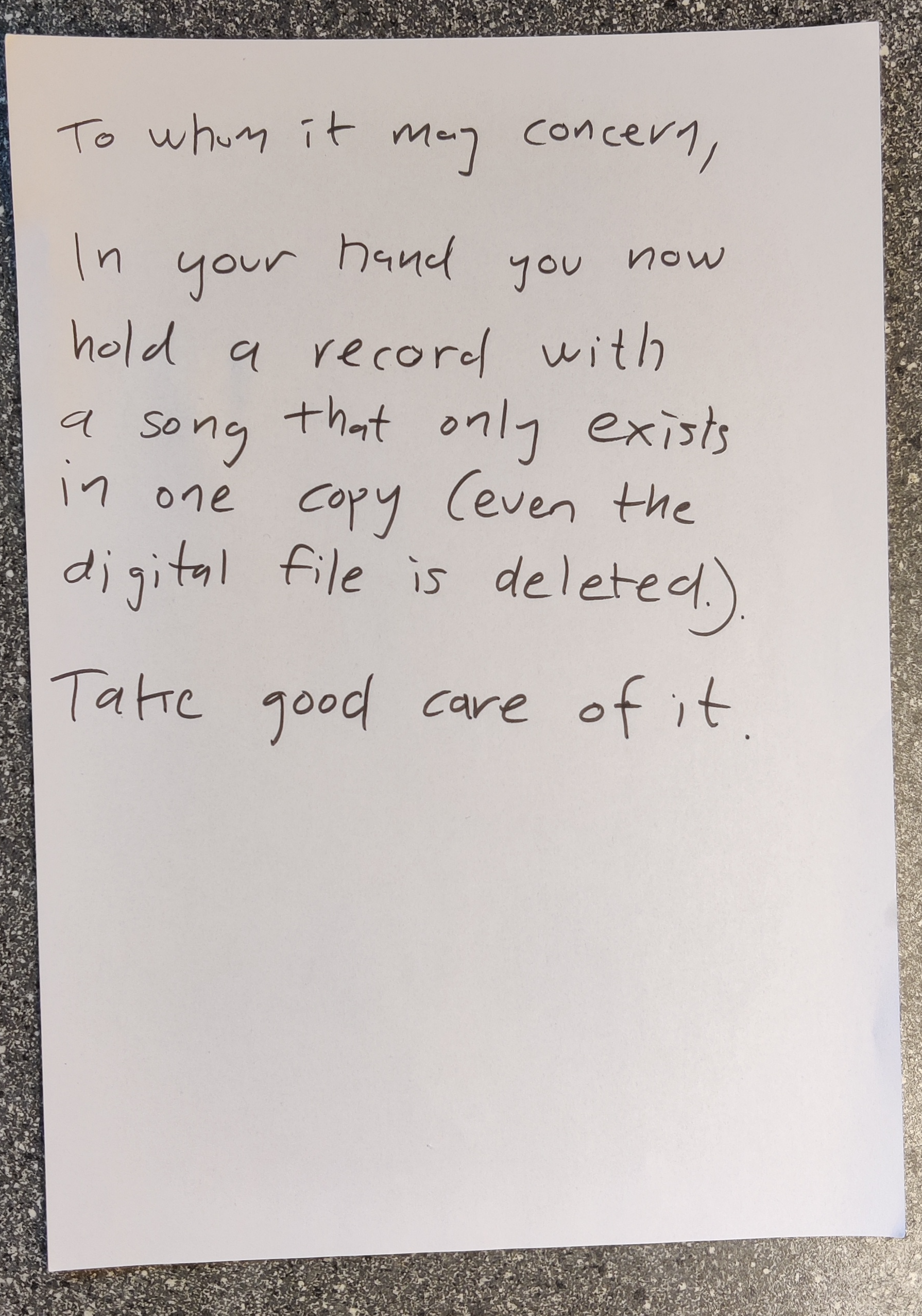 The three B-sides for the singles were buried in three corners of the world. As always, the digital files were deleted. Each song only exists on the vinyl record buried in the ground.